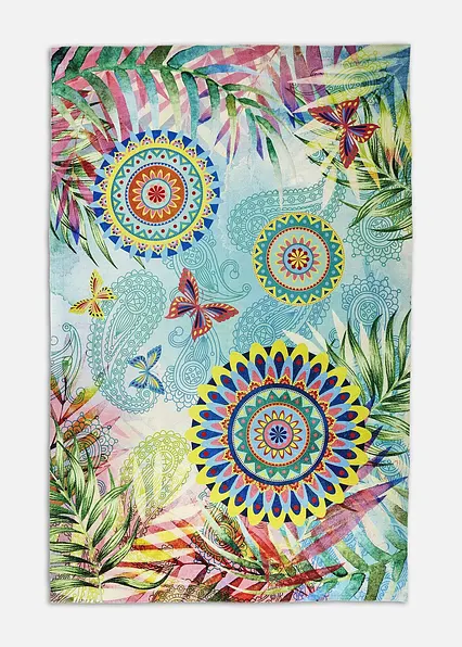 Handgewebter und bedruckter Teppich, phantasievolle Motive in fröhlichen Farben, in trendigem Digitaldruck. Pflegeleichtes Flachgewebe, strapazierfähig und robust, daher nicht nur für den Eingangsbereich und Wohnraum geeignet, sondern auch für Terrasse oder Balkon, alle Maße sind ca. Maße,