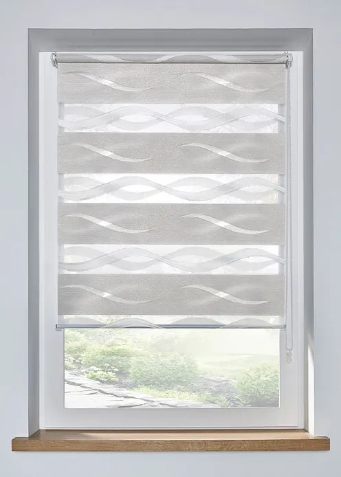 Die aufwendige Jacquard Verarbeitung mit zweifacher Farbkombination verleiht diesem Doppelrollo eine besonders schöne und harmonische Optik. Hintereinander liegende transparente und intransparente Stoffabschnitte laufen parallel wodurch sich der stufenlose Lichteinfall je nach Bedarf individuell regulieren lässt. Die Einstellung für einen hellen Raum ist ebenso möglich wie Licht und Sichtschutz.