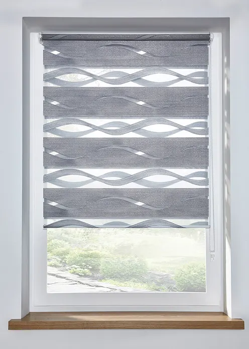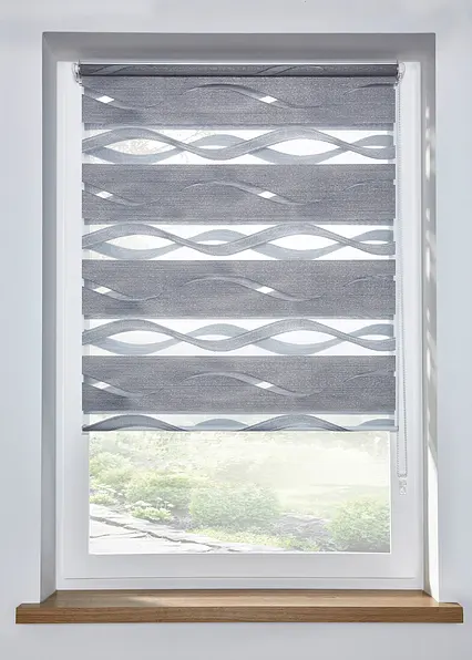 Die aufwendige Jacquard Verarbeitung mit zweifacher Farbkombination verleiht diesem Doppelrollo eine besonders schöne und harmonische Optik. Hintereinander liegende transparente und intransparente Stoffabschnitte laufen parallel wodurch sich der stufenlose Lichteinfall je nach Bedarf individuell regulieren lässt. Die Einstellung für einen hellen Raum ist ebenso möglich wie Licht und Sichtschutz.