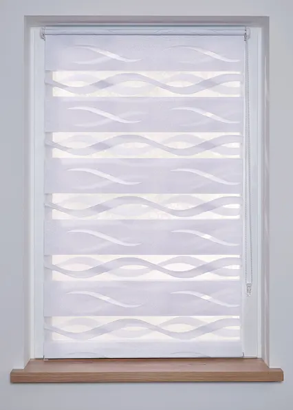Die aufwendige Jacquard Verarbeitung mit zweifacher Farbkombination verleiht diesem Doppelrollo eine besonders schöne und harmonische Optik. Hintereinander liegende transparente und intransparente Stoffabschnitte laufen parallel wodurch sich der stufenlose Lichteinfall je nach Bedarf individuell regulieren lässt. Die Einstellung für einen hellen Raum ist ebenso möglich wie Licht und Sichtschutz.