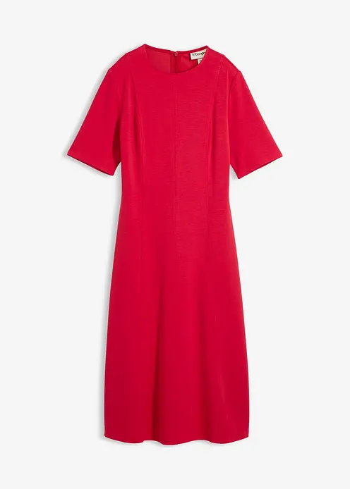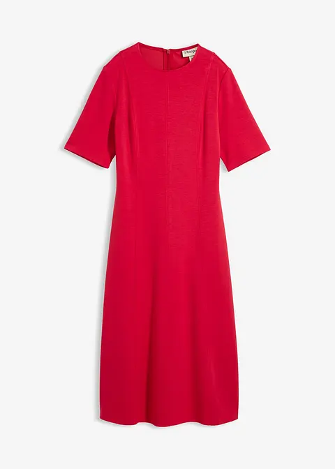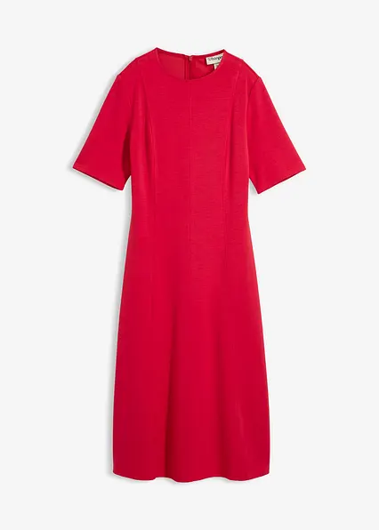 Midikleid mit vertikalen Teilungsnähten sowie einem voluminösem ausgestellten Rock. Verdeckter Reißverschluss hinten.