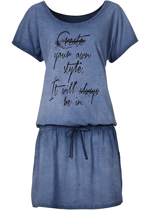 Mit dem Shirtkleid sind Sie im Sommer modisch angezogen. Das leichte Material überzeugt mit einer coolen Waschung und optimalem Tragekomfort. Das Modell ist locker geschnitten und an der Hüfte mit einem Gummibund und einem Bindeband versehen.Vorne ist das Kleid mit einem tollen Spruch bedruckt. Seitlich sind zwei Eingrifftaschen eingenäht.