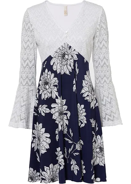 Verspielt und Feminin: Boho-Kleid mit Spitzen-Einsatz im Oberteil und Jersey-Rock, mit seinem Allover-Druck macht es jedes Teil zu einem Unikat.