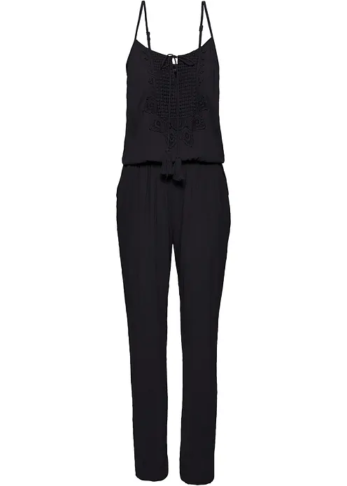 Luftiger Overall mit Spitze am Ausschnitt mit Kordeln zum Binden. Verstellbare Träger, elastisches Gummiband in der Taille und am Beinabschluss, sowie im Rückenbereich und seitliche Eingrifftaschen. Weich fließender Webstoff aus 100% Viskose in Krepp-Optik.