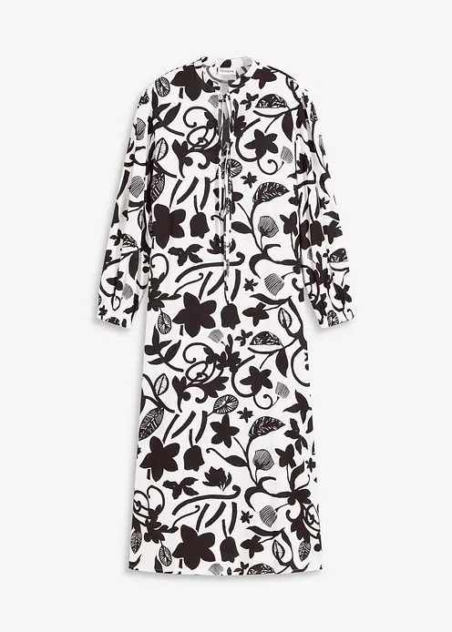 modisch bedrucktes Kaftan-Kleid in maxilänge aus fließender Viskose mit zwei kleinen Bindebändern vorne am Ausschnitt und Bindeband in der Taille