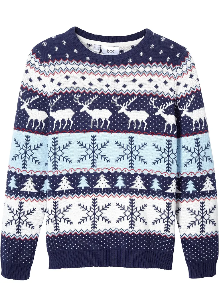 Toller weihnachtlicher Pullover mit großflächigem Muster für Jungs. Der Strickpullover ist perfekt für die kälteren Tage geeignet und punktet durch seine angenehme Baumwoll-Qualität und die Rippbündchen mit einem optimalen Tragekomfort. Ein Must-Have für das Eingrooven auf die Weihnachtszeit!