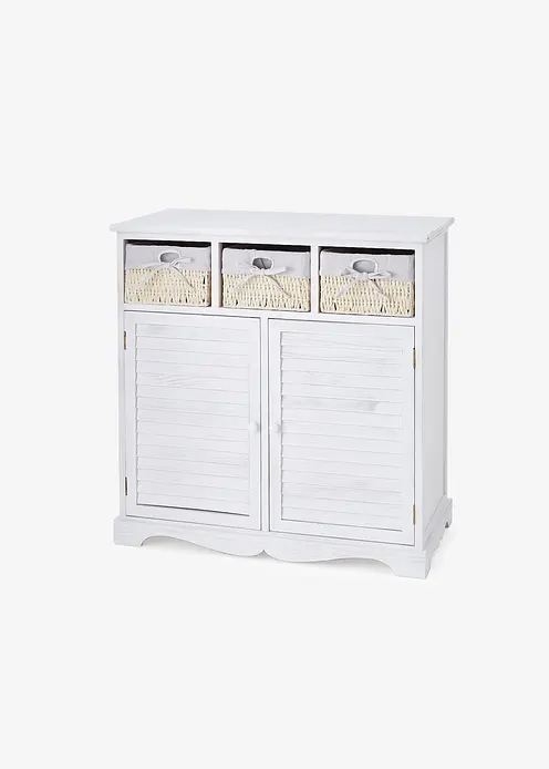 Schickes Stauraumwunder: Diese Kommode begeistert durch ihr wunderschönes Design, da sie im mediterranen Landhausstil daherkommt. Die Lamellentüren sowie die mit Stoffeinsatz versehenen Körbe sind ein echter Hingucker. Besonders hübsch ist auch die weiße Wischoptik, die der Kommode ihren besonderen Charme verleiht. Reichlich Stauraum befindet sich in den drei Schubladen sowie hinter den beiden Schranktüren, wo sich ein Einlegeboden befindet. Wunderschön und praktisch: Diese Kommode setzt daheim harmonische Akzente.