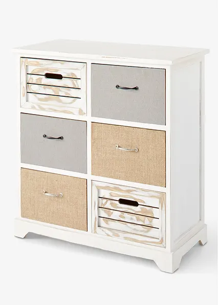 Mit abwechslungsreichen Fronten punktet die trendige Kommode. Auf der Vorderseite sind die Schubladen mit geschmackvollen Textilstoffen bespannt oder im angesagten Used-Finish gestaltet. Die praktische Kommode bietet reichlich Stauraum. Zum Einsatz kommt sie im Wohnzimmer, Esszimmer oder in der Diele, wo sie das natürlich lebensfrohe Ambiente sehenswert unterstützt. Mit ihrem dekorativen Design ist sie sehr kombinationsfreudig. Ideal bereichert die trendige Kommode die Einrichtung im angesagten Landhausstil