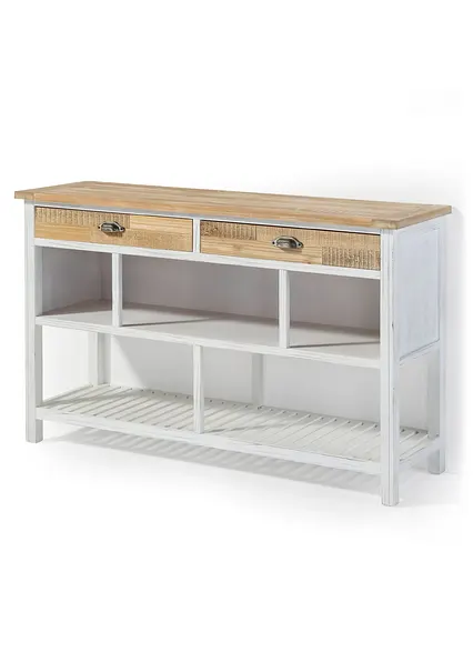 Diese hübsche Konsole mit 2 Schubladen, die mit Apotheker-Griffen versehen sind, und fünf offene Fächer, in unterschiedlichen Größen, eigenen sich ideal als Stauraum.