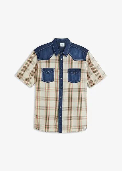 Modernes Westernhemd im Regular Fit mit kontrastierenden Denim-Details, angesagtem Karomuster, Brusttasche und coolen Metallknöpfen