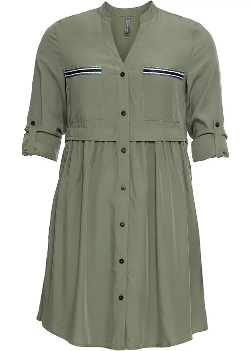 Das kurze Hemdblusenkleid spielt mit einer Reihe von Details: Ein Riegel-Knopf-Element fixiert die gekrempelten Ärmel. Ein markanter, kontrastfarbiger Einsatz setzt die beiden Brusttaschen in Szene. An einen kleinen Stehkragen schließt ein V-Ausschnitt an. Ab der Taille fällt das trendige Hemdblusenkleid in kleinen Falten locker herab. Eingrifftaschen und die durchgehende Knopfleiste machen den coolen Look perfekt.