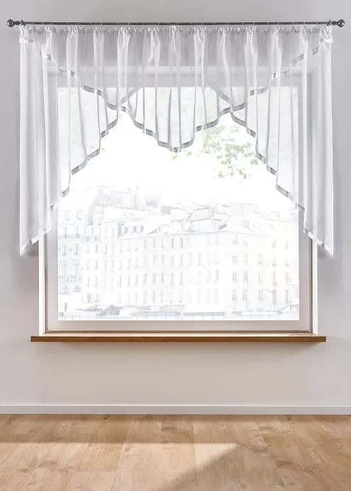 Kuvertstore aus transparenter Voile Qualität in weiß, mit Satinband am Abschluss in weiß oder die Höhenangabe bezieht sich auf die langen Außenseiten. Das Mittelteil ist bei allen Größen 80cm lang.