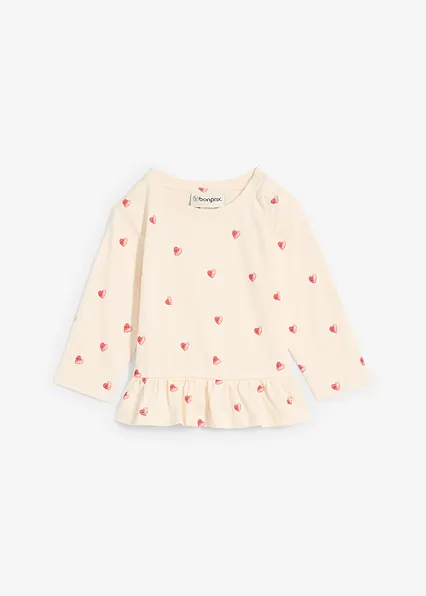 Langarmshirt aus reiner Bio-Baumwolle mit kleinen Herzmotiven. Mit Teilungsnaht und Rüschen am Saum für einen verspielten Look. Weiches Material für angenehmen Tragekomfort.