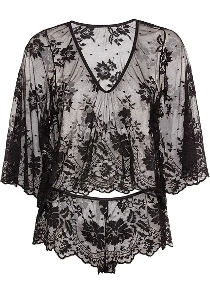 Dieses erotische Set aus Langarmtop und Panty verzaubert mit transparenter Spitze. Die elastische Spitze schmiegt sich komfortabel an die Haus an und der tiefe V-Ausschnitt macht Ihr Dekolleté zu einem hübschen Hingucker. Die starke Transparenz der Spitze lässt Ihre Rundungen verführerisch durchschimmern und die eng anliegende Panty verziert Ihren Po elegant. Das Set ist auch in großen Größen erhältlich.