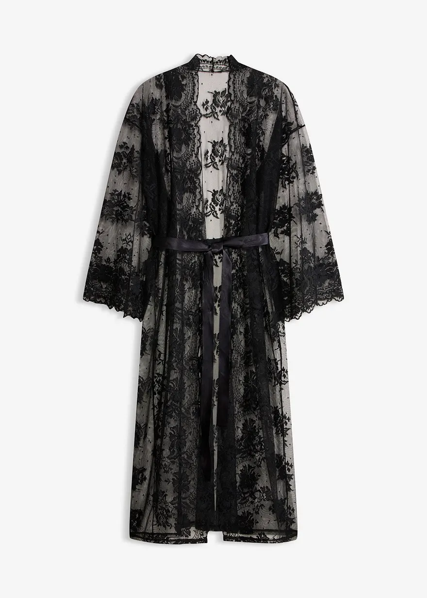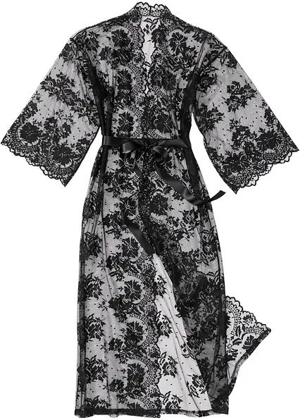 Zart schmiegt sich der durchsichtige Stoff des langen Kimonos Ihren Körper. Nackte Haut schimmert durch feine transparente Spitze. Im lässig-eleganten Kimono fühlen Sie sich angezogen, lassen aber dennoch Ihre Reize spielen. Tragen Sie ihn als Morgenmantel, als Schlafrock oder werfen Sie ihn einfach an einem verschlafenen Sonntag über. Wenn Sie mögen, kombinieren Sie ihn auch mal mit Dessous und High Heels - auch Ihem Partner wird dieser Hauch von Nichts gefallen!