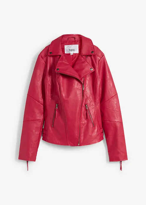 Mit dieser Lederimitatjacke von bpc sind Sie in der Freizeit gut angezogen.Die Jacke aus Lederimitat präsentiert sich im modischen Bikerstil. Kennzeichnend dafür sind der seitlich versetzte Reißverschluss, der Kragen und das Revers. Auf der Vorderseite hat die Übergangsjacke zwei Eingrifftaschen mit Reißverschlüssen. Seitlich im Hüftbereich sind Schnallen zum Regulieren der Weite eingearbeitet. Druckknöpfe und Teilungsnähte sowie Reißverschlüsse am Armabschluss zeigen sich als weitere Details.