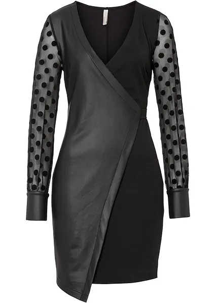Lederimitat-Kleid mit Jersey-Einsatz und gepunkteten Mesh-Ärmel