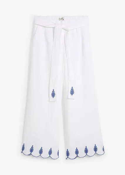 schöne Premium Leinen-Culotte mit passendem Bindegürtel und schmückender Stickerei