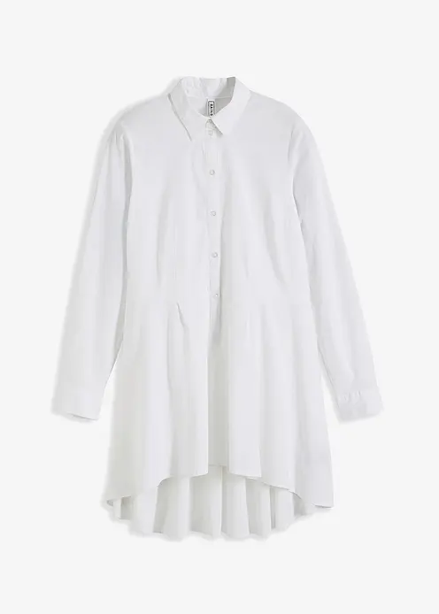 Diese angesagte Longbluse setzt sich cool in Szene. Das beeindruckende Design punktet mit der weiten A-Linie. Durch das Schößchen mit längerer Rückseite entsteht eine attraktive Optik im Vokuhila-Look. Besonders stylish wirkt der Hemdkragen. Breite Manschettenärmel lassen sich leger aufkrempeln und mit dekorativen Riegeln fixieren. Die Knopfleiste in der vorderen Mitte reicht bis zur Taille und bildet einen geschmackvollen Verschluss.