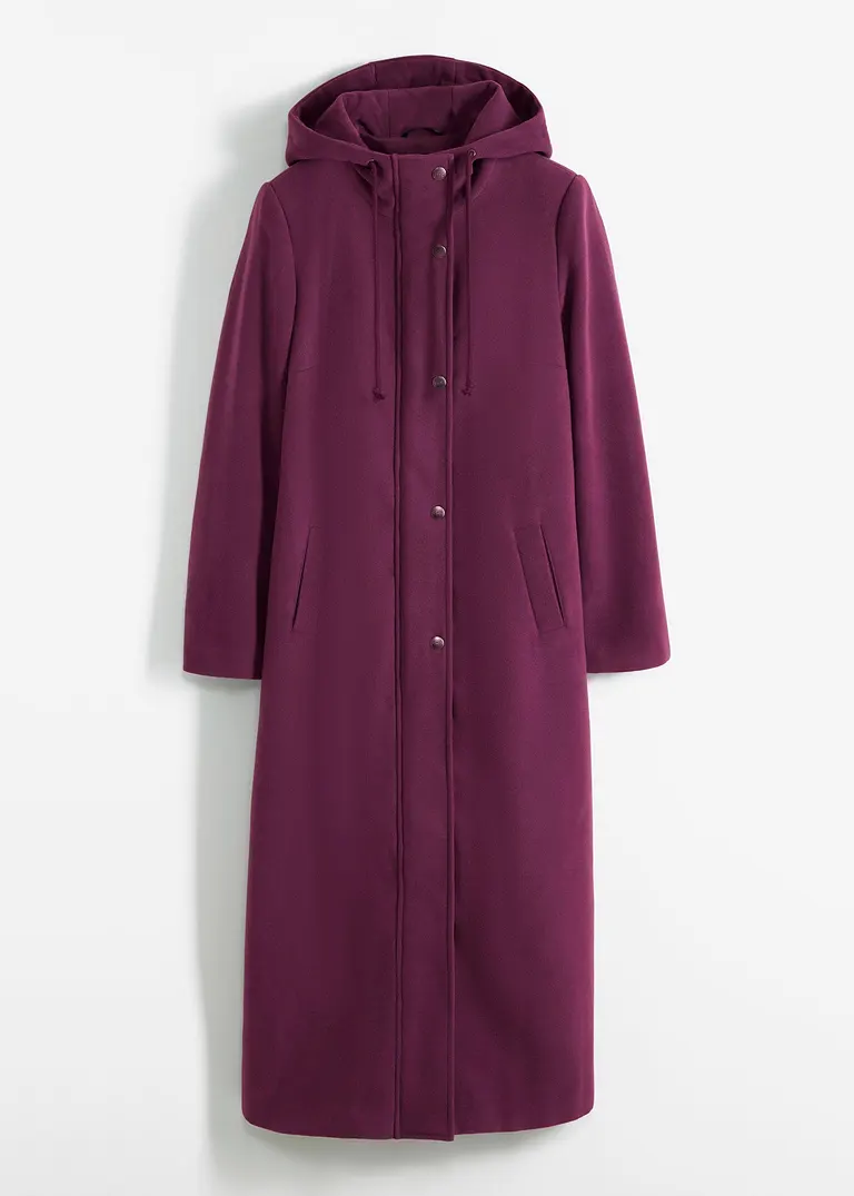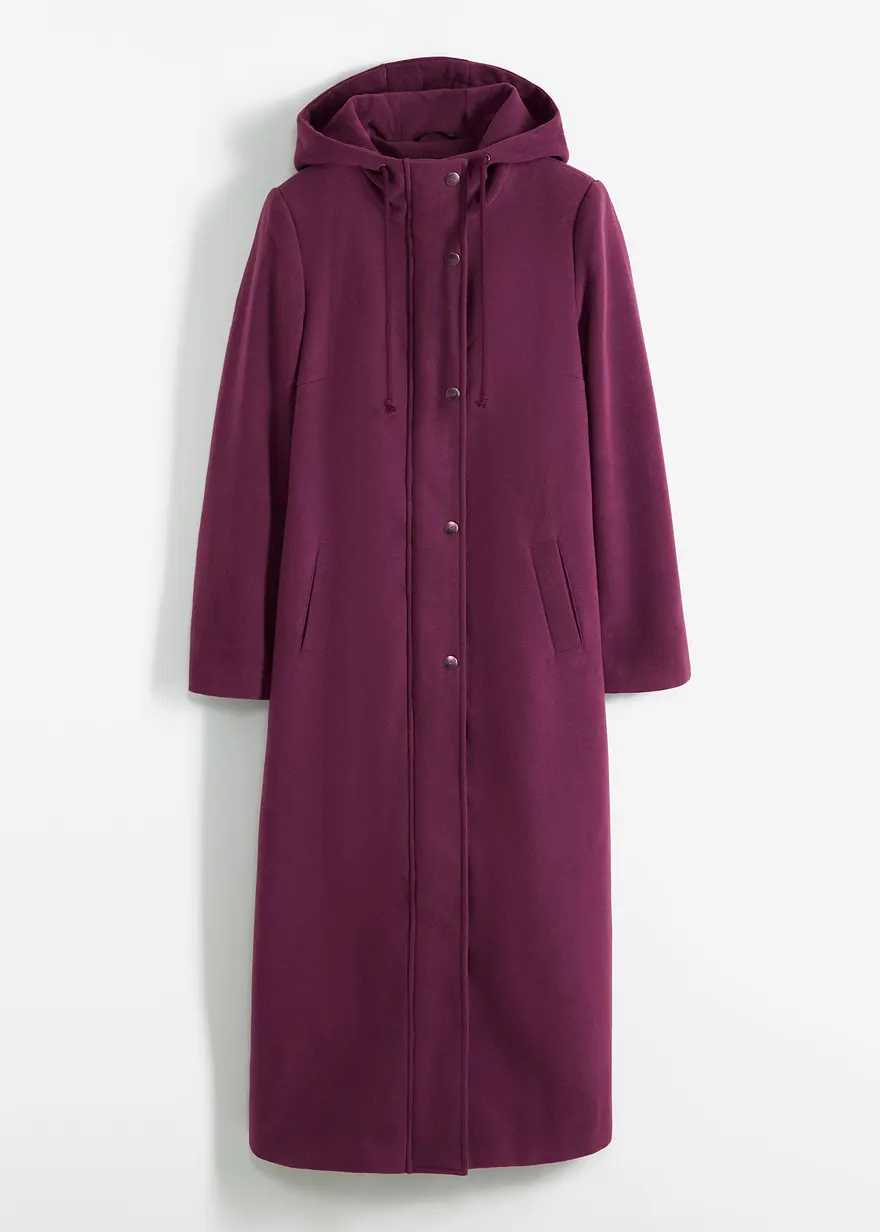 Lässiger Longmantel in Wolloptik mit Kapuze und Kordelzug, seitliche Eingriffstaschen