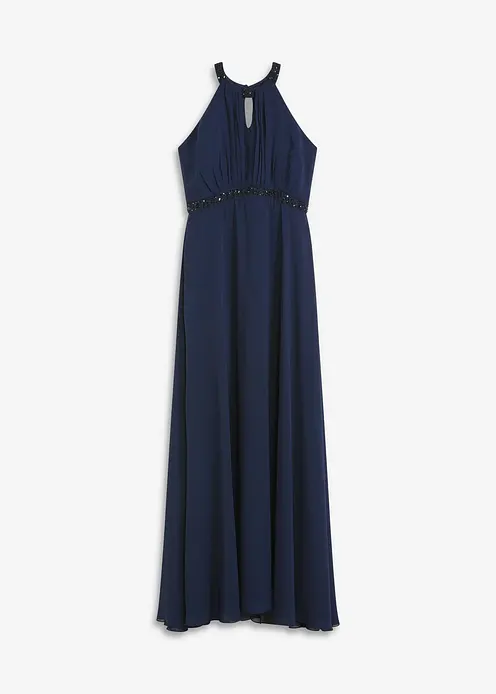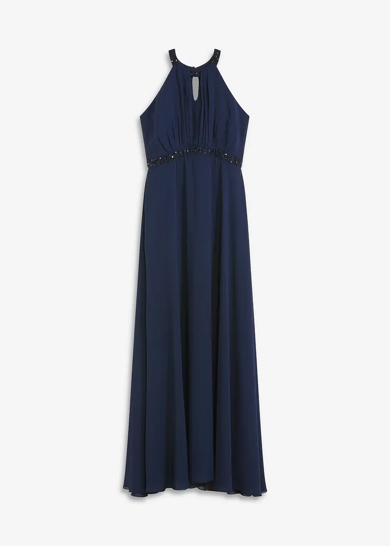 Modern und feminin: Abendkleid in Maxi-Länge mit Perlen-Applikation am Ausschnitt und Unterbrust-Einsatz.