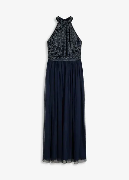 Modern und feminin: Abendkleid in Maxi-Länge mit Neckholder aus feinem Tüll und mit Paillettenstickerei
