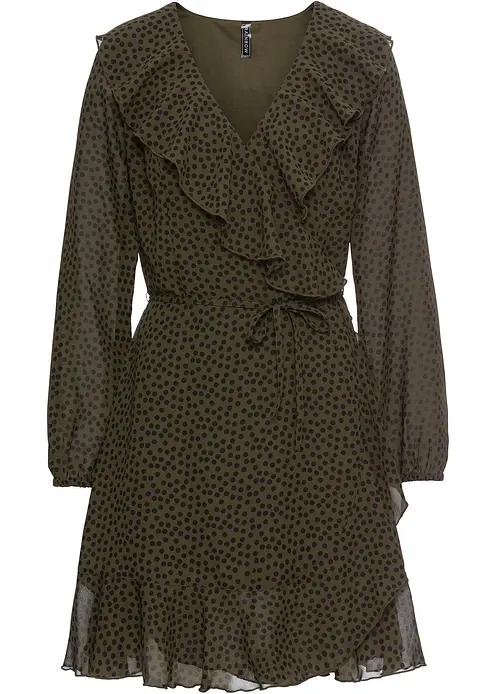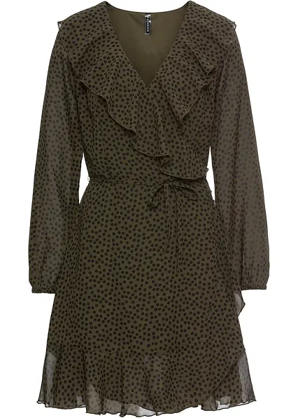 Der angesagte Allover-Pünktchen-Look sorgt bei diesem Kleid in Wickeloptik mit Volants für Furore. Zum auffälligen Design gesellen sich breite Volants am großzügigen V-Ausschnitt. Auch die Saumkante bekommt mit einem Stoffeinsatz eine raffinierte Note. In Kombination mit dem Bindeband erhält das langärmlige Kleid mit Wickeleffekt und Rüschen eine feminine Silhouette.Das trendy Kleid mit Volants und elastischen Ärmelabschlüssen verzaubert zu Pumps oder Ballerinas und verträumter Hochsteckfrisur.