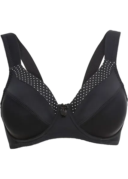 Das zeitlose Pünktchenmuster am oberen Cup verleiht dem Funktions-BH eine besonders feminine Optik. Die Minimizer-Form mit Bügeln bringt optisch kleinere Brüste und sorgt für einen guten Halt. Der Verschluss und die verstellbaren Träger fallen bei den größeren Cups breiter aus.