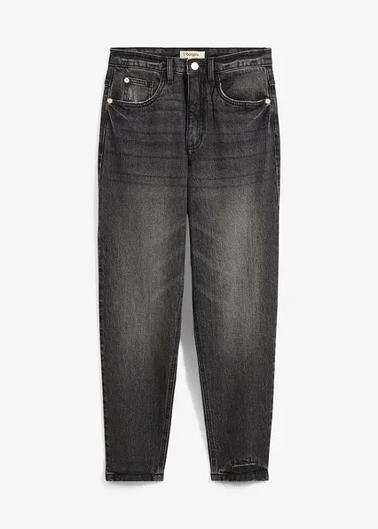 Mom Jeans mit hohem Bund aus einem festen Baumwolldenim, der sich zunächst etwas steif anfühlt und durch häufiges Tragen weicher und lockerer wird.