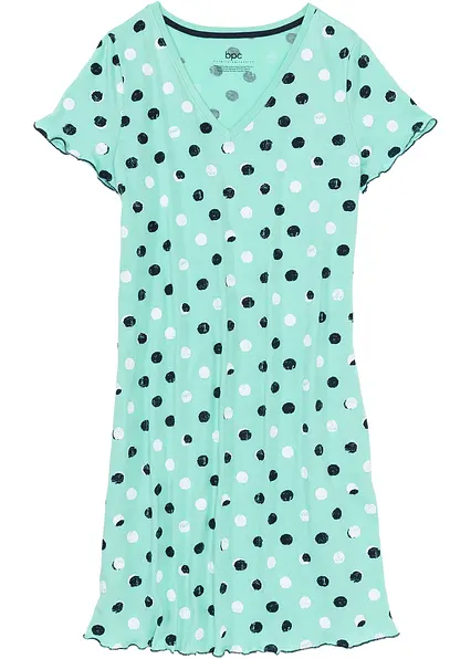 Dieses bequeme Nachthemd präsentiert sich ansprechend mit einem gerundeten V-Ausschnitt und kurzen Ärmeln. Das Longshirt umspielt schön die Figur. Mit seinem angenehm zu tragenden Baumwollmaterial gehört es zu den Basics im Kleiderschrank.Ein hübsches Detail bei diesem Modell sind die dekorativen Wellenkanten an Saum und Ärmelabschlüssen.