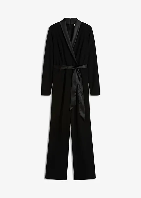 Modern und feminin: Overall aus strukturiertem Crêpe mit Satin-Einsatz in der Taille und am Kragen