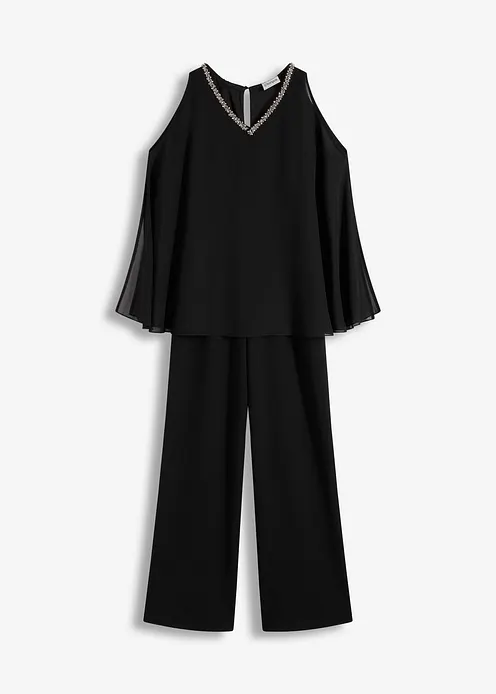 Modern und feminin: Overall aus strukturiertem Crepe mit kaschierendem Überwurf aus feinem Chiffon und Strasssteinverzierungen am Ausschnitt
