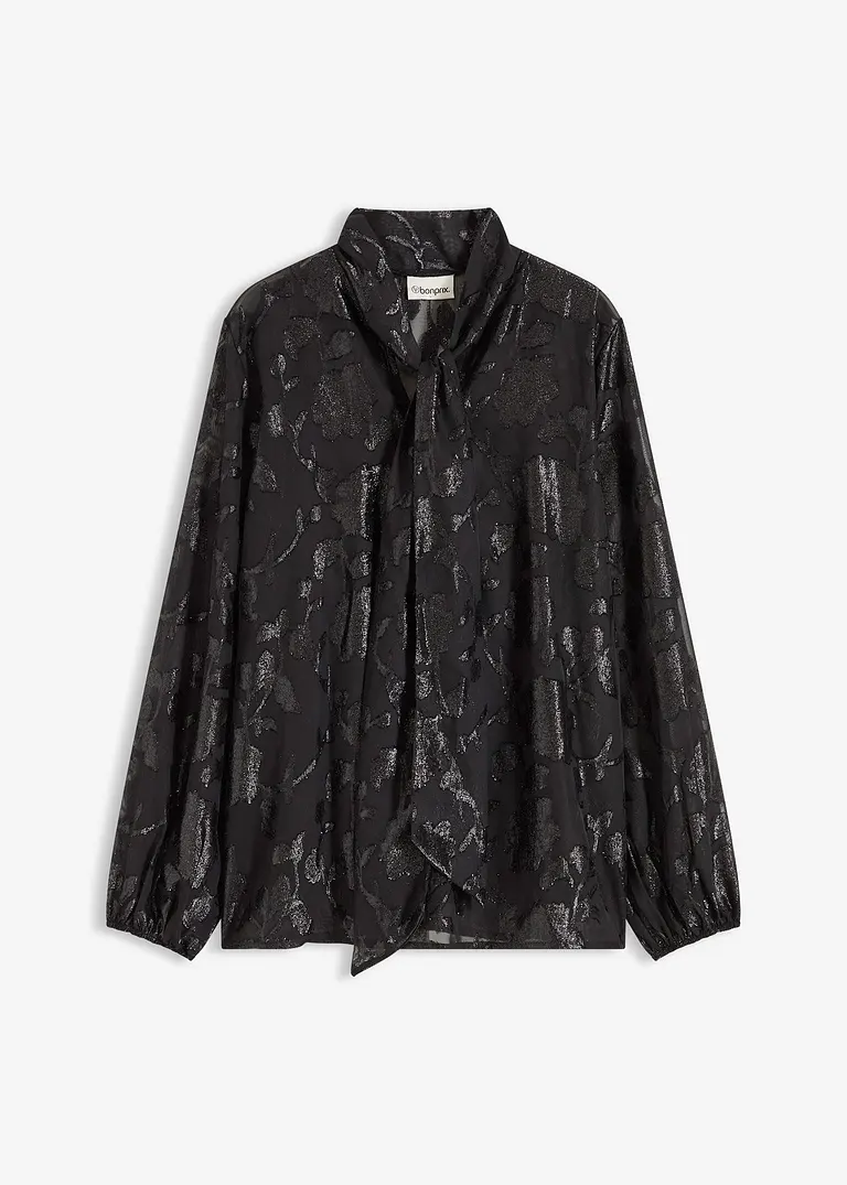 Modern und feminin: Bluse floraler Stickerei mit Glanz und Binde-Detail am Kragen