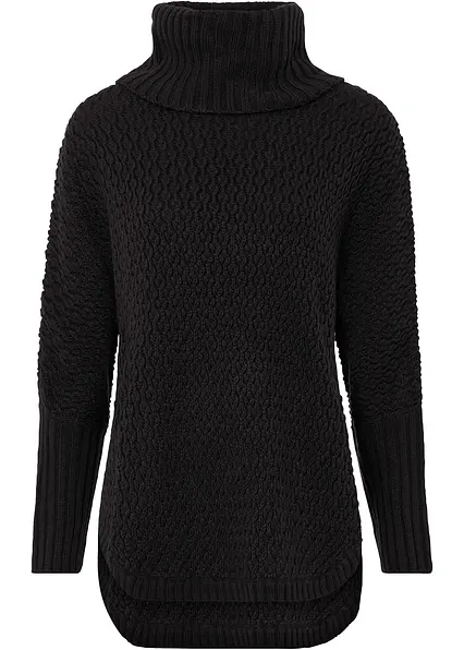 Modischer Oversize-Pullover mit Ajour-Muster, sowie einem großen Rollkragen und zwei seitlichen Schlitzen.