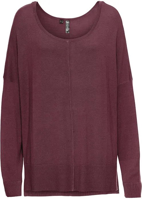 Der weit geschnittene Pullover erhält durch die Trennungsnaht vom Rundhals-Ausschnitt bis hinunter zum Saum seine interessante Optik. Hinten ist der gerippte Saum länger geschnitten als die Vorderseite und an den Seiten ist das Modell leger geschlitzt.