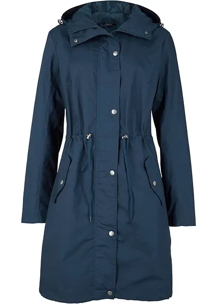 Der komfortable, lang geschnittene und figurumspielende Schnitt machen den Parka zum gern getragenen Lieblingsteil. Der Parka hat seitliche Eingrifftaschen mit Klappen und Druckknopfverschluss sowie eine Kapuze. Die Weite ist auf Taillenhöhe regulierbar.