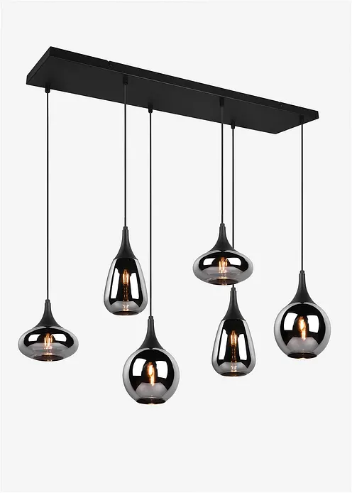 Die Pendelleuchte ist durch die edlen Glasschirme ein besonderer Eyecatcher in Deinem Wohnbereich! Die unterschiedlichen Formen der sechs Schirme sowie die Komposition aus Metall und Glas sorgen für eine schöne und einzigartige Lichtatmosphäre und hauchen dem Essbereich einen modernen Touch ein. Dank der Farbgestaltung in Schwarz matt und den Glasschirmen in Chrom gedampft gibt es viel Spielraum für weitere Farbtöne, wodurch das Integrieren in vorhandene Wohnkonzepte wunderbar einfach ist. Für eine energiesparende Beleuchtung empfiehlt sich die Verwendung eines LED Leuchtmittels. Diese sind eine optimale Alternative zu herkömmlichen Halogen Leuchtmitteln und stehen für eine hohe Lichtqualität und eine Energieeinsparung von bis zu 80%. Zusätzlich profitiert man bei LED Leuchtmitteln von einer langen Lebensdauer, einer geringen Wärmeentwicklung und schonen gleichzeitig die Umwelt.