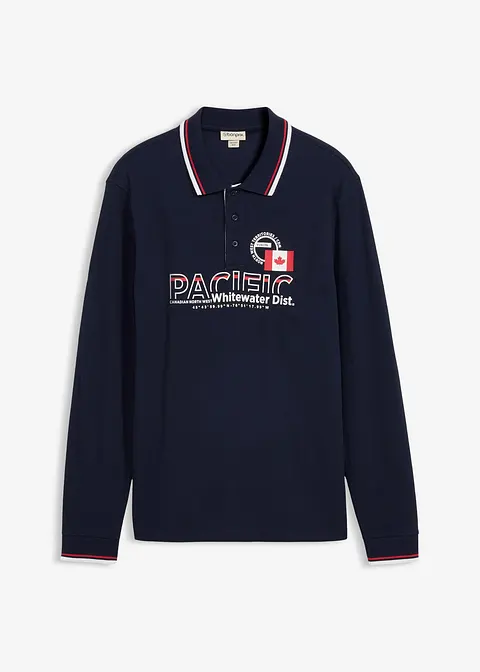 Klassisches Langarm-Poloshirt mit geradem Saum und coolen Kontraststreifen. Ein Druck ziert die Brust.