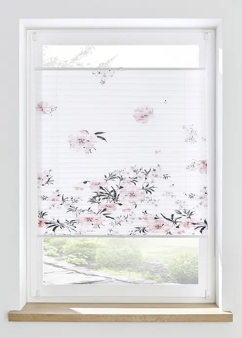 Das Plissee hat einen modernen Sockeldruck, d.h. der Blumendruck rankt sich von unten Richtung Mitte. Das ergibt einen modernen und luftigen Eindruck. Das Plissee wird ganz einfach und ohne Bohren oder Schrauben mit Hilfe von Kunststoff-Klemmträgern auf dem Fensterrahmen (bis 2cm möglich) montiert. Es ist stufenlos und von oben und unten verstellbar.