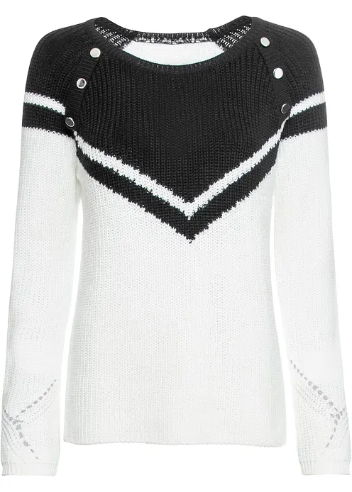 Schöner Pullover von BODYFLIRT. Er hat einen Rundhalsausschnitt und Knöpfe an den Schultern. Länge in Größe 36/38 ca. cm.
