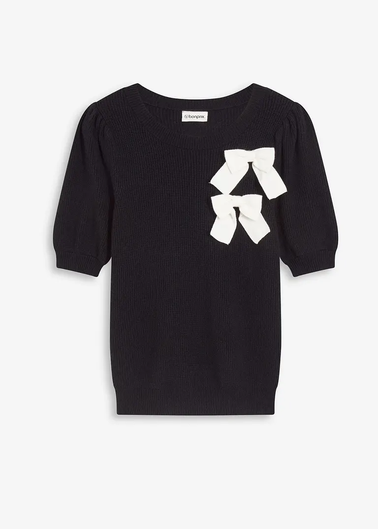 modischer Pullover mit Puffärmeln und dekorativer Schleifen-Applikation vorne