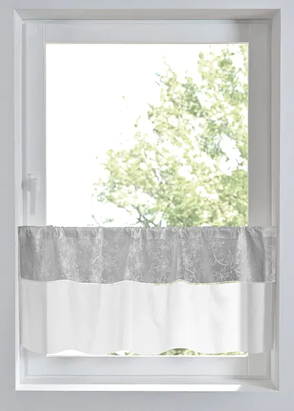 Küchengardine mit verspielten Details. Die romantische Blumenstickerei wird mit einer Spitzenkante abgerundet.