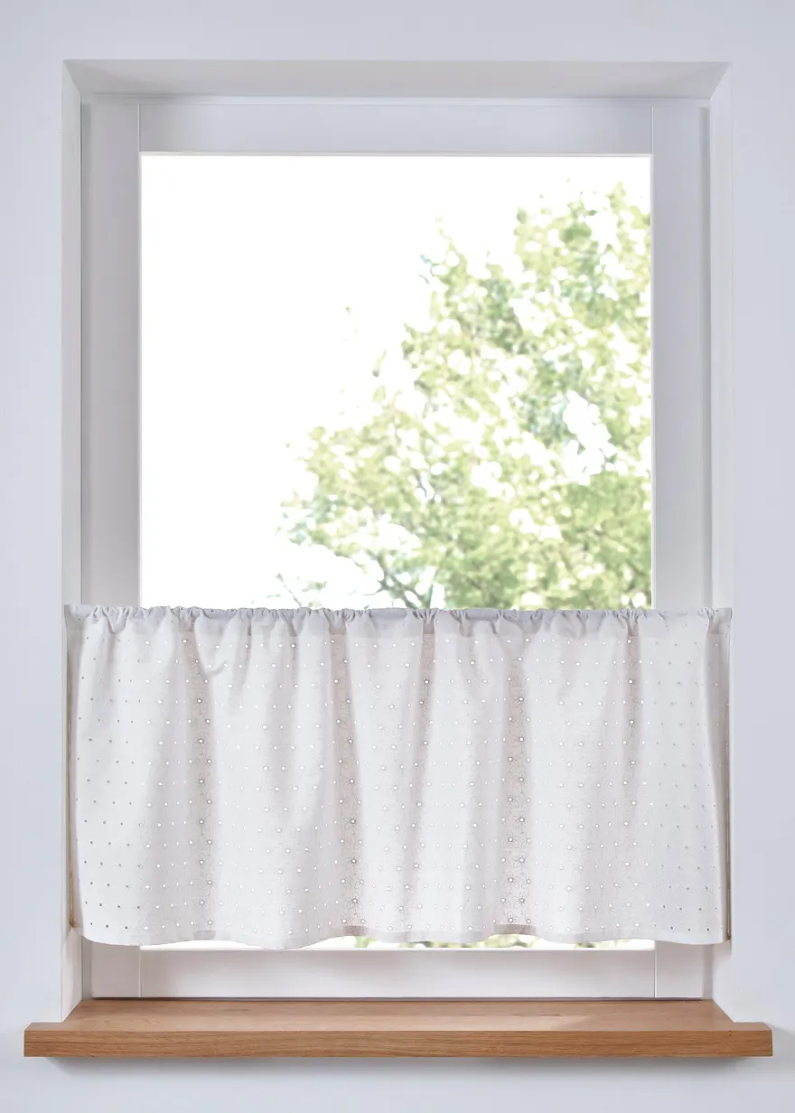 Verwandle deine Küche in einen Raum voller Charme und Privatsphäre mit unserer blickdichten Küchengardine aus Bio-Baumwolle. Die florale Lochstickerei verleiht dieser Küchengardine eine raffinierte Textur und einen Hauch von Romantik, der jeden Raum verschönert. Der Baumwollstoff an sich ist blickdicht, aber durch die Lochstickerei gelangt Tageslicht hindurch.