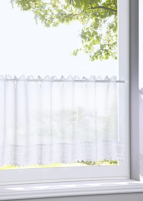 Die Scheibengardine ist eine schlichte Dekoration für dein Küchenfenster. Sie hat am unteren Abschluss eine Stickerei-Kante. Mit der Lochleiste lässt sich die Scheibengardine kinderleicht an einer Teleskopstange zum Klemmen oder Einhängen dekorieren. Passend für Stangen mit bis zu 3cm Durchmesser.