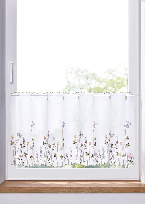 Wohnliche Scheibengardinen mit floraler Stickerei in Leinen-Optik und Lochleiste für Stangen bis maximal 3cm Durchmesser.