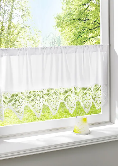 Romantisch verspielt schmückt diese Scheibengardine ihr Küchenfenster: unsere blickdichte Scheibengardine ist im tollen Landhausstil gefertigt und präsentiert sich mit einer schönen Häkelkante. Ab 60cm Höhe ist in der Mitte eine zusätzliche Häkelkante eingearbeitet. Tunnelzug passend für Stangen mit bis zu 3cm Durchmesser.