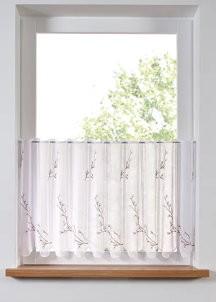 Dezente Scheibengardine mit recyceltem Polyester und hochwertiger Stickerei. Die Lochleiste lässt den Stoff nach dem Anbringen wunderschön und elegant schwingen.