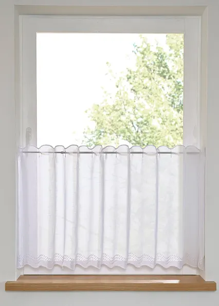 Die Küchengardine in weiß mit dezenter Stickerei passt in nahezu jede Küche und schmückt Dein Fenster auf die dezente Art.