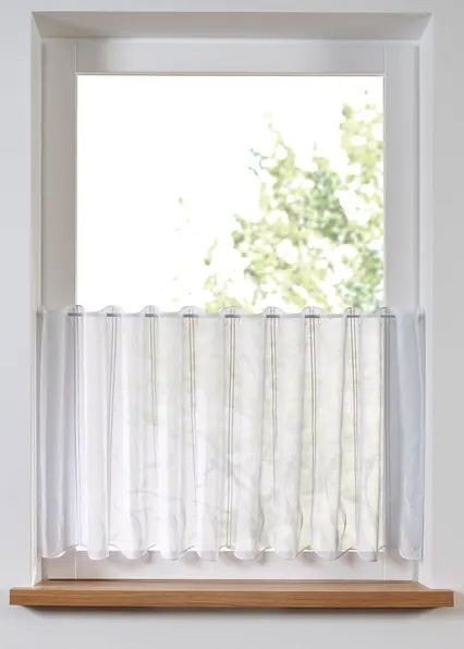 Dezente Scheibengardine mit recyceltem Polyester und moderner Stickerei. Die Lochleiste lässt den Stoff nach dem Anbringen wunderschön und elegant schwingen.