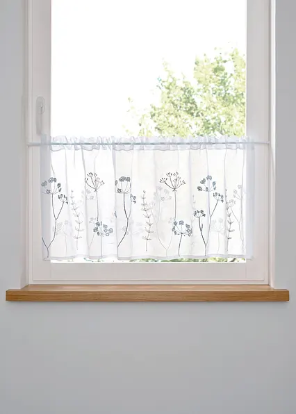 Mit dieser Küchengardine gelingt dir im Handumdrehen eine schöne Dekoration an deinem Küchenfenster. Sie hat eine zarte Stickerei und ist aus einem leichten Gewebe mit Struktur gefertigt. Tunnelzug passend für Stangen mit bis zu 3cm Durchmesser.